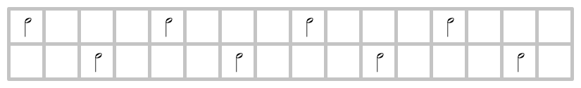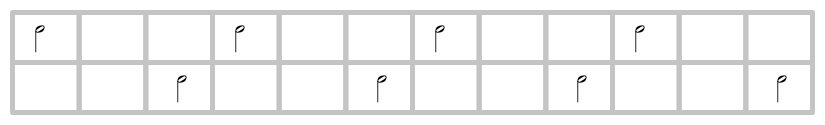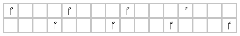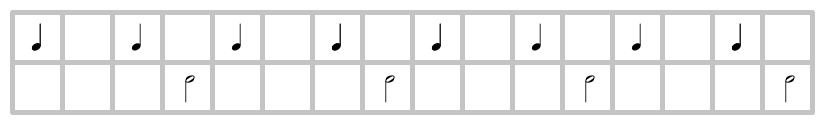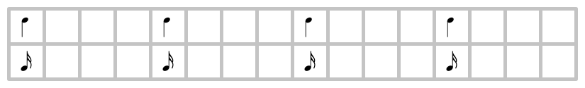 人間は直接このリズムを叩くことはできない。何故なら人間は時間を一定周期で分割する能力しか持たないからだ。だが次のように工夫することで叩くことができる。