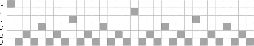 この様に音価ごとに無駄な音(表拍)を整理すると、音価が層になって横方向に広がり重なり合っている様子が観察できる。またそれぞれの音かの拍が異なる音価の拍と重なりあうことなく避けあっている点も観察できる。