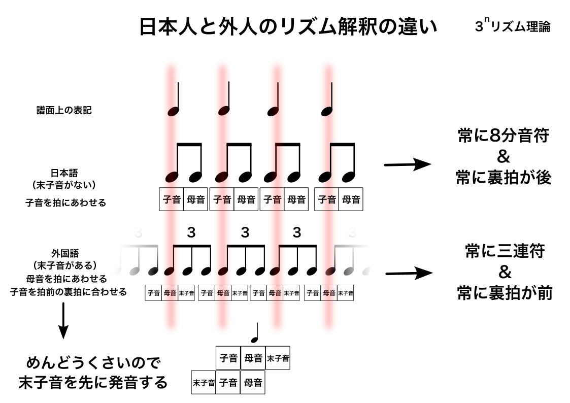日本人がグルーヴを感覚的に理解できない理由はここにあります。─── 英語の音楽が何故3⁻ⁿになるのか…と表現するより、日本語の音楽が何故2⁻ⁿになるのかと表現した方がより本質を言い当てています。世界中のリズムの大半はシラブル拍リズムで末子音を持っています。末子音をもたない日本語のリズムの方がずっと奇異なのです。